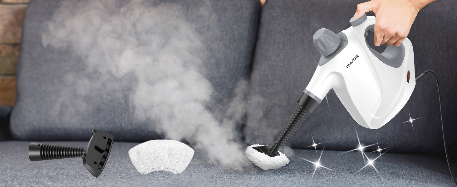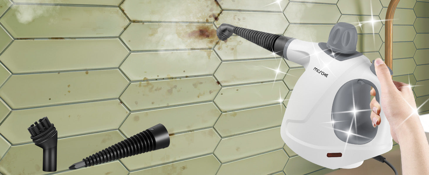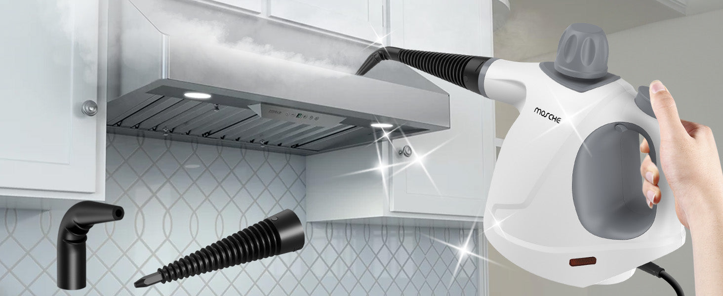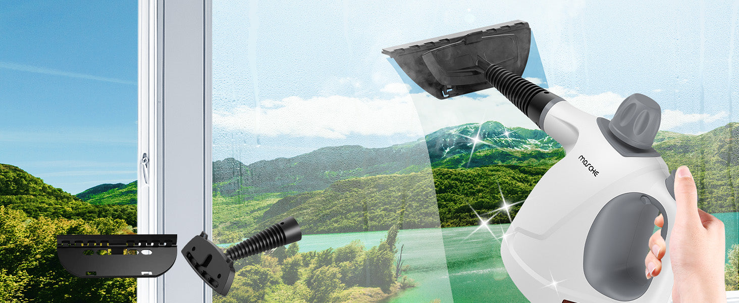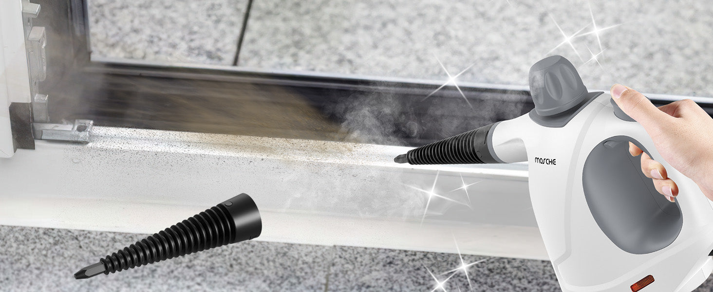 <b>11-Pieces Cleaning Tool:</b><br> 1 × Measuring cup<br> 1 × Funnel<br> 1 ×Towel Sleeve<br> 1 × Nozzle<br> 1 × Bent Nozzle<br> 3 × Round Brushes<br> 1 × Cone-Shaped Nozzle<br> 1 × Faric-Cleaning Accessory<br> 1 × Glass-Cleaning Accessory<br><br> <b>Extension Hose</b><br> The safe and reliable handheld steam cleaner for home naturally using only water without chemical so it do nothing harmful. Pretty safe for the family who with kids, the old, pregnant and pets.<br><br> <b>Quick Steam Technology</b><br> Handheld steam cleaner has quick steam technology, using the water tank capacity up to 15.21OZ(450ML). The recommended Max water capacity is within 11.83OZ(350ML) to leave a certain space to ensure normal use. The steam cleaner for home heats up fast in 3-5 minutes and emits pressurized powerful hot steam 230℉(110℃) for up to 8-12 minutes!<br><br> <b>Multiple-Use Steam Cleanr</b><br> This steam cleaner can be used to clean your stoves, window glass, toilet, clothes, car, floor, furniture and barbecue grill.<br><br> Steam cleaner is compact and powerful, it is a good helper for your home cleaning.