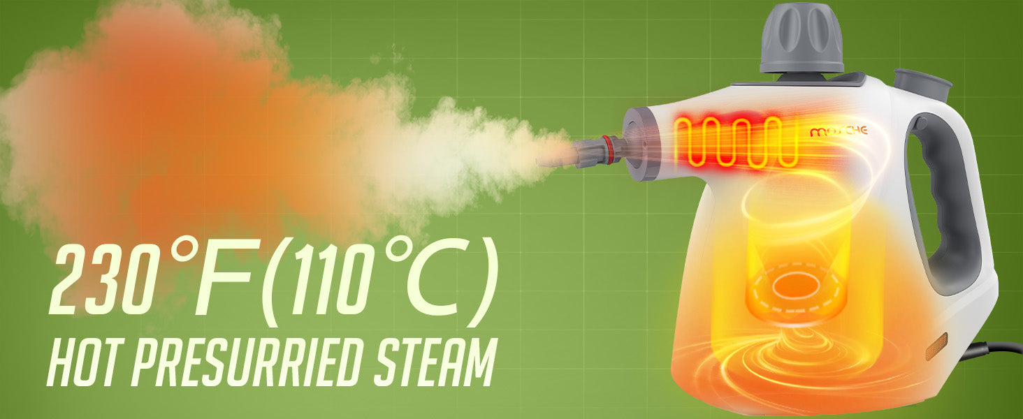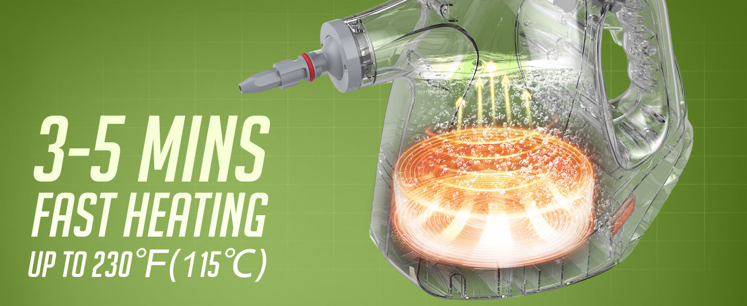 【Hot Steamer for Cleaning】Our 1050 watts steamer for cleaning can heat up fast in 3-5 minutes and emits pressurized powerful hot steam 230℉(110℃) for up to 8-12 minutes!