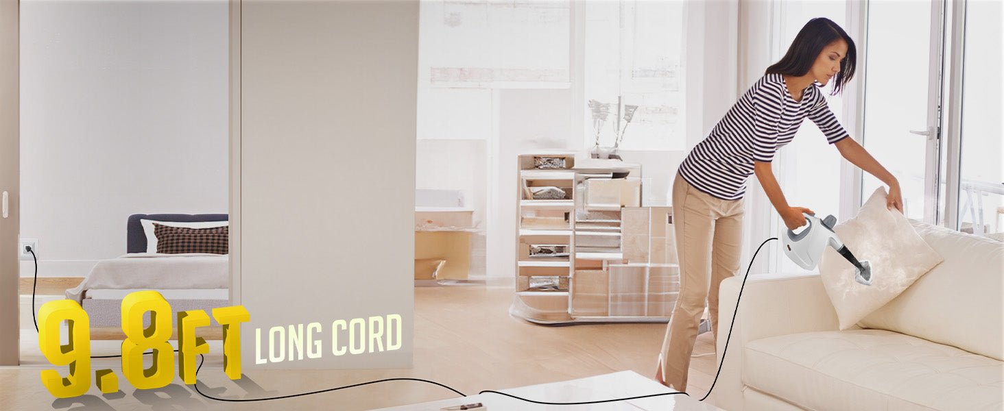 【 Handheld Steamer for Cleaning】 This 9.8ft(3m) cord design make our steam cleaner easily to carry from room to room and also allows for greater flexibility when cleaning your house anywhere.